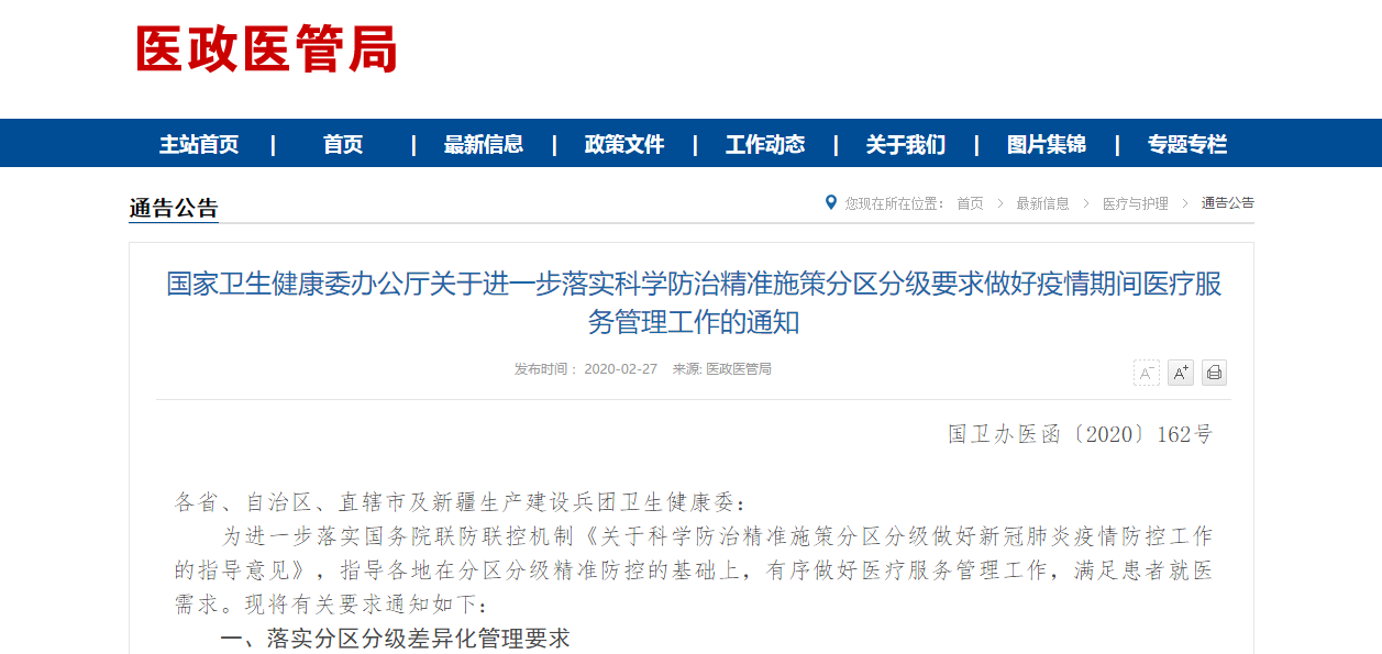 國家衛(wèi)健委發(fā)布《關(guān)于進(jìn)一步落實(shí)科學(xué)防治精準(zhǔn)施策分區(qū)分級(jí)要求做好疫情期間醫(yī)療服務(wù)管理工作的通知》