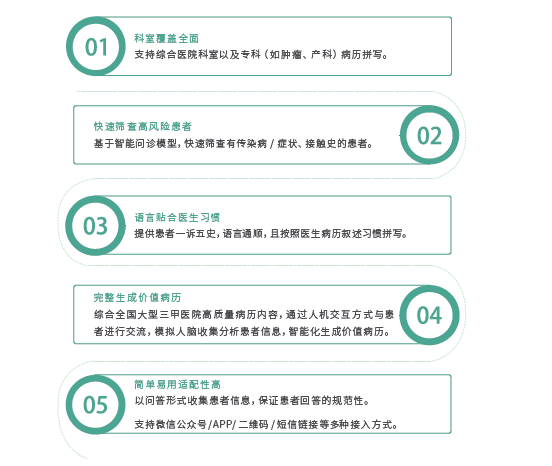 該系統(tǒng)支持綜合醫(yī)院、??漆t(yī)院等多類型醫(yī)療機構(gòu)使用場景,支持結(jié)構(gòu)化數(shù)據(jù)輸出和科研隨訪數(shù)據(jù)采集,具有覆蓋科室全面、語言貼合醫(yī)生習(xí)慣、完整生成價值病歷和快速篩查高風(fēng)險患者等優(yōu)勢。