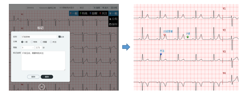 在心電波形圖上直接進(jìn)行各種標(biāo)識(shí),能夠清晰體現(xiàn)異常出現(xiàn)的位置,作為診斷結(jié)論的下達(dá)依據(jù),標(biāo)記點(diǎn)可直接用于查詢統(tǒng)計(jì)與科研分析。